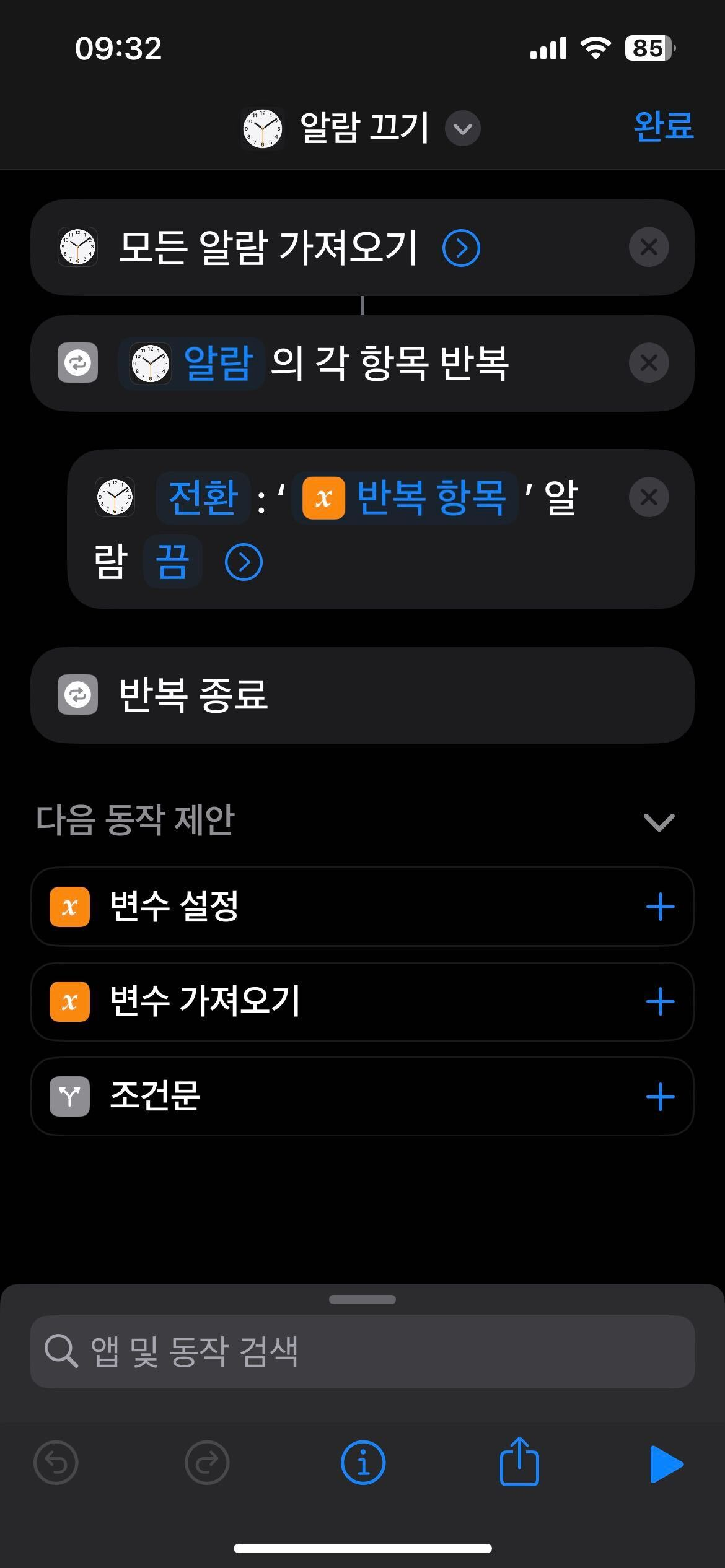 이제 아침에 모든 알람을 한번에 꺼주는 단축어 만들 일만 남았다.